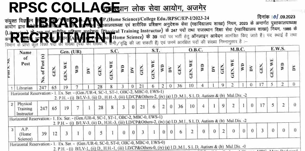 राजस्थान लोक सेवा आयोग द्वारा एक बार फिर रोजगारो को दिया गया सुनहरा अवसर। राजस्थान लोक सेवा आयोग ने 01 सितंबर 2023 को कॉलेज लाइब्रेरियन भर्ती का दिया शानदार मौका, 247 पदो की भर्ती होगी।