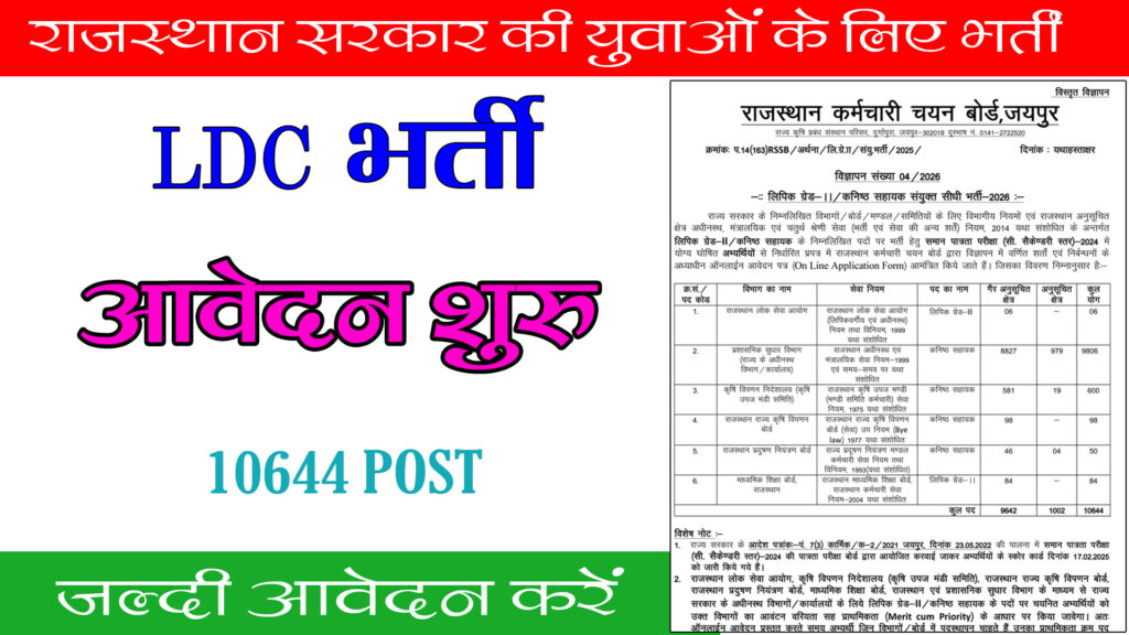 RSSB Clerk LDC Recruitment 2026: राजस्थान के उन लाखों युवाओं के लिए नए साल का सबसे बड़ा धमाका हो चुका है, जो सरकारी कार्यालयों में बाबू LDC बनने का सपना देख रहे थे उनका सपना साकार होता हुआ दिख रहा हैं और उनके लिए सर्कार के द्वारा यह भर्ती का पिटारा खोला गया हैं राजस्थान कर्मचारी चयन बोर्ड (RSSB) ने क्लर्क ग्रेड-II और कनिष्ठ सहायक (Junior Assistant) के कुल 10,644 पदों के लिए आधिकारिक नोटिफिकेशन जारी कर दिया है। 15 जनवरी 2026 से इसके ऑनलाइन आवेदन शुरू हो चुके हैं। यदि आप 12वीं पास हैं और आपके पास कंप्यूटर का सर्टिफिकेट है, तो यह सुनहरा मौका आपको हाथ से नहीं जाने देना चाहिए।